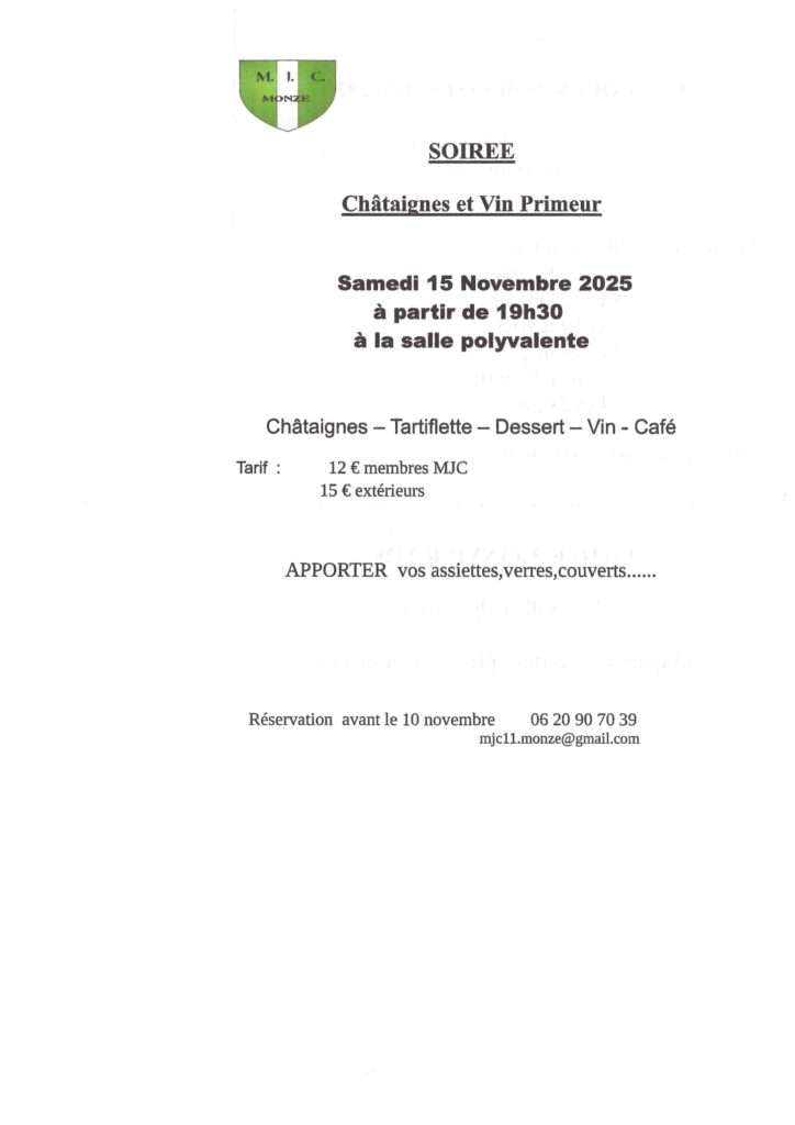 Châtaignes et Vin primeur à Monze Auteur/autrice de la publication :Corinne Micheau Publication publiée :6 novembre 2025 Post category:Non classé Commentaires de la publication :0 commentaire Please Share This Partager ce contenu Ouvrir dans une autre fenêtre Ouvrir dans une autre fenêtre Ouvrir dans une autre fenêtre Ouvrir dans une autre fenêtre Ouvrir dans une autre fenêtre Ouvrir dans une autre fenêtre Ouvrir dans une autre fenêtre Ouvrir dans une autre fenêtre Ouvrir dans une autre fenêtre Ouvrir dans une autre fenêtre Vous devriez également aimer Marché des créateurs et des produits locaux 12 mai 2025 Restaurant scolaire 7 juin 2024 Restaurant scolaire 20 juin 2023 Laisser un commentaire Annuler la réponseCommentEnter your name or username to comment Enter your email address to comment Saisir l’URL de votre site (facultatif) Enregistrer mon nom, mon e-mail et mon site dans le navigateur pour mon prochain commentaire.