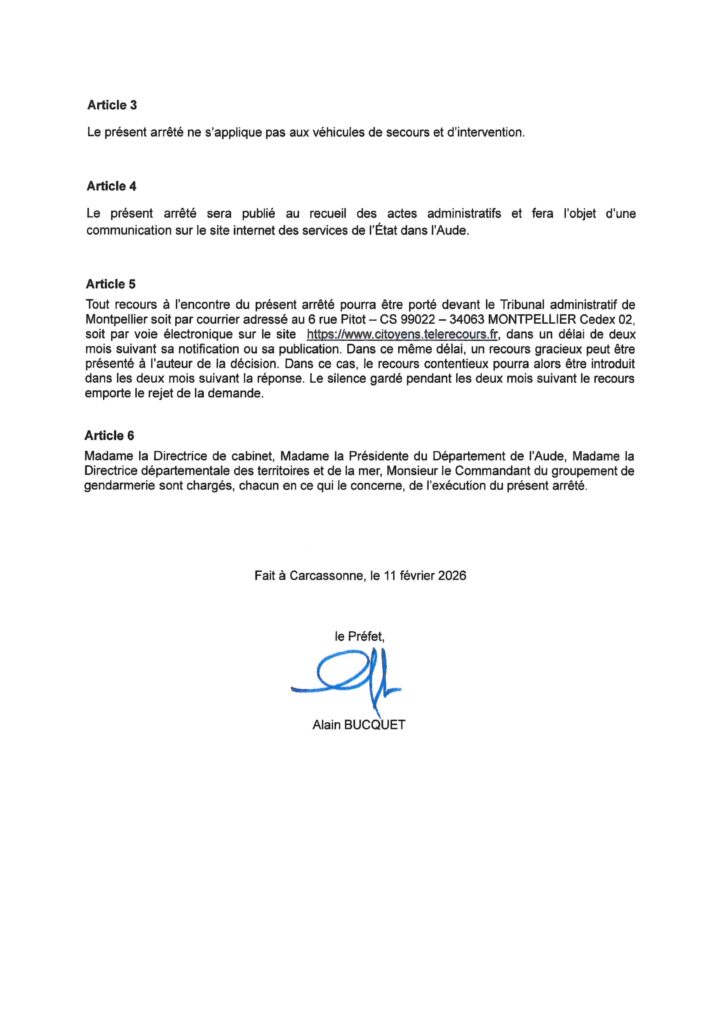 Arrêté Préfectoral DDTM-SAFEB-UFCB-20266025 Auteur/autrice de la publication :Corinne Micheau Publication publiée :11 février 2026 Post category:Non classé Commentaires de la publication :0 commentaire Please Share This Partager ce contenu Ouvrir dans une autre fenêtre Ouvrir dans une autre fenêtre Ouvrir dans une autre fenêtre Ouvrir dans une autre fenêtre Ouvrir dans une autre fenêtre Ouvrir dans une autre fenêtre Ouvrir dans une autre fenêtre Ouvrir dans une autre fenêtre Ouvrir dans une autre fenêtre Ouvrir dans une autre fenêtre Vous devriez également aimer SécheresseAude2023, Communiqué de Presse 24 juillet 2023 Don de sang 18 novembre 2025 Restaurant scolaire 7 mars 2024 Laisser un commentaire Annuler la réponseCommentEnter your name or username to comment Enter your email address to comment Saisir l’URL de votre site (facultatif) Enregistrer mon nom, mon e-mail et mon site dans le navigateur pour mon prochain commentaire.