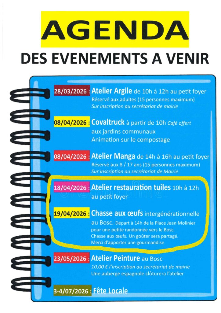 Atelier Restauration Tuiles et Chasse aux œufs Auteur/autrice de la publication :Corinne Micheau Publication publiée :14 avril 2026 Post category:Non classé Commentaires de la publication :0 commentaire Deux dates à retenir : le samedi 18 avril avec la restauration des tuiles et le dimanche 19 avril avec la chasse aux œufs ! Please Share This Partager ce contenu Ouvrir dans une autre fenêtre Ouvrir dans une autre fenêtre Ouvrir dans une autre fenêtre Ouvrir dans une autre fenêtre Ouvrir dans une autre fenêtre Ouvrir dans une autre fenêtre Ouvrir dans une autre fenêtre Ouvrir dans une autre fenêtre Ouvrir dans une autre fenêtre Ouvrir dans une autre fenêtre Vous devriez également aimer Conseil Municipal 27 mars 2025 Nouvelles restrictions, Crise de sécheresse 24 juillet 2023 Calendrier des Pompiers 22 novembre 2022 Laisser un commentaire Annuler la réponseCommentEnter your name or username to comment Enter your email address to comment Saisir l’URL de votre site (facultatif) Enregistrer mon nom, mon e-mail et mon site dans le navigateur pour mon prochain commentaire.